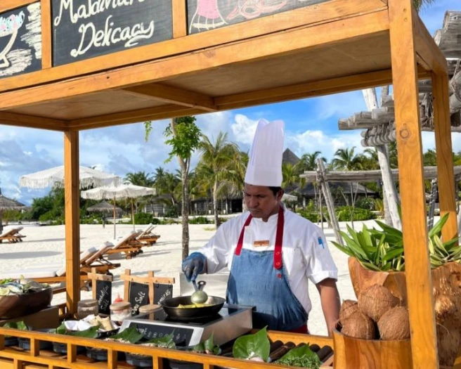 Sustainable clay ware and handcrafted wooden plates adorn the tables, while the gentle sounds of waves caress the air. Here, age-old recipes are given a new lease on life, transformed into sophisticated small plates that tantalize the taste buds. Each dish is meticulously crafted, showcasing the freshest local ingredients and the magic of Maldivian culinary heritage.